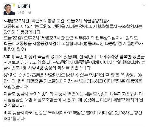 이재명 페이스북.이재명 경기 성남시장이 '세월호 7시간'과 관련, 박근혜 대통령을 고발하는 등 연일 강경 행보를 펼치자 지지율도 놀라운 상승세를 보이고 있다.