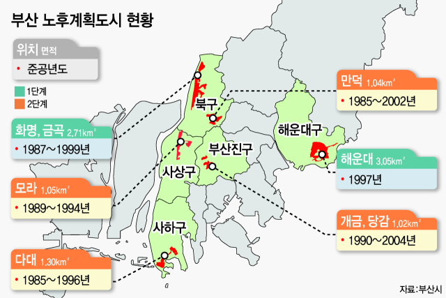 부산시는 8일 화명·금곡지구와 해운대지구를 대상으로 한 노후계획도시정비 기본계획 1단계 사업을 고시했다. 지난 2일 국토부로부터 사업 승인을 받은 시는 이날 사업 계획을 고시하며 지역 내 노후 신도시 재건축이 본궤도에 오르게 됐다고 평가했다. 산과 강, 바다가 공존하는 부산은 천혜의 자연환경에도 불구하고 도시 공간 활용에는 큰 제약을 받아 왔다. 시가 특·광역시 가운데 가장 먼저 노후 신도시 정비사업을 추진해 온 것도 이 때문이다.