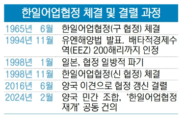 한일어업협정은 각국 어선이 상대국 EEZ에서 정해진 양과 기간만 조업을 허용하는 일이다. 한국과 일본은 1965년 국교정상화 일환으로 처음 협정을 체결했다. 하지만 1996년 일본이 유엔해양법을 근거로 자국 연안 200해리(약 370km)까지를 EEZ로 선포하며 기존 어업협정을 일방적으로 파기했다. 이에 양국은 1998년 한일어업협정을 다시 체결했고 매년 협상을 통해 이를 갱신했다. 하지만 2016년 한일 관계가 악화하면서 어업협정이 끊겼고 8년간 방치됐다.