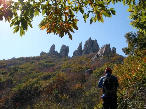 뒤가 열린 능선길을 30분 정도 더 걸으니 망부석 같은 바위가 늠름하게 버티고 섰다. 선인봉(선봉)이다. 바야흐로 바위의 열병식이 시작되는가 보다. 천자의 면류관을 닮은 구정봉의 바위들이 올려다 보인다.