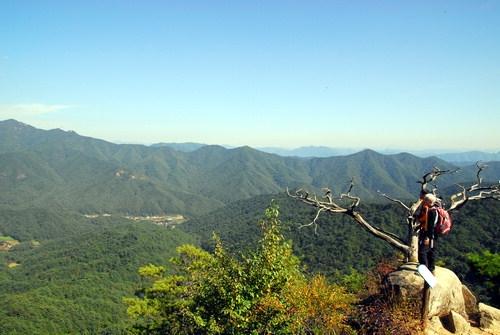 2분쯤 가면 인간의 탄생을 뜻하는 제2봉 아이봉이다. 4분 거리에 제3봉 장생봉이 있다. 장생봉에서 제4봉 관대봉까지는 10분쯤. 중간에 안부와 헬기장을 지난다. 여기서 5분 정도 오르면 제5봉인 대왕봉이다. 지금까지 봉우리 중 조망이 제일 낫다. 기암 틈에 뿌리를 내린 늙은 소나무가 위태로워 보인다. 벼랑에 서서 아래를 내려다봤다. 백척간두 그 자체다. 사자산과 백덕산(1,350m)이 둘러싼 법흥사가 발아래에 보인다. 830봉과 877봉을 스쳐 제6봉 관망봉에 오른다. 사위가 탁 트였다. 멀리 서쪽으로 치악과 감악의 산줄기가 헌걸차게 앉았다. 남쪽으로 고개를 돌리니 백두대간 소백산의 암봉이 어슴푸레하다.