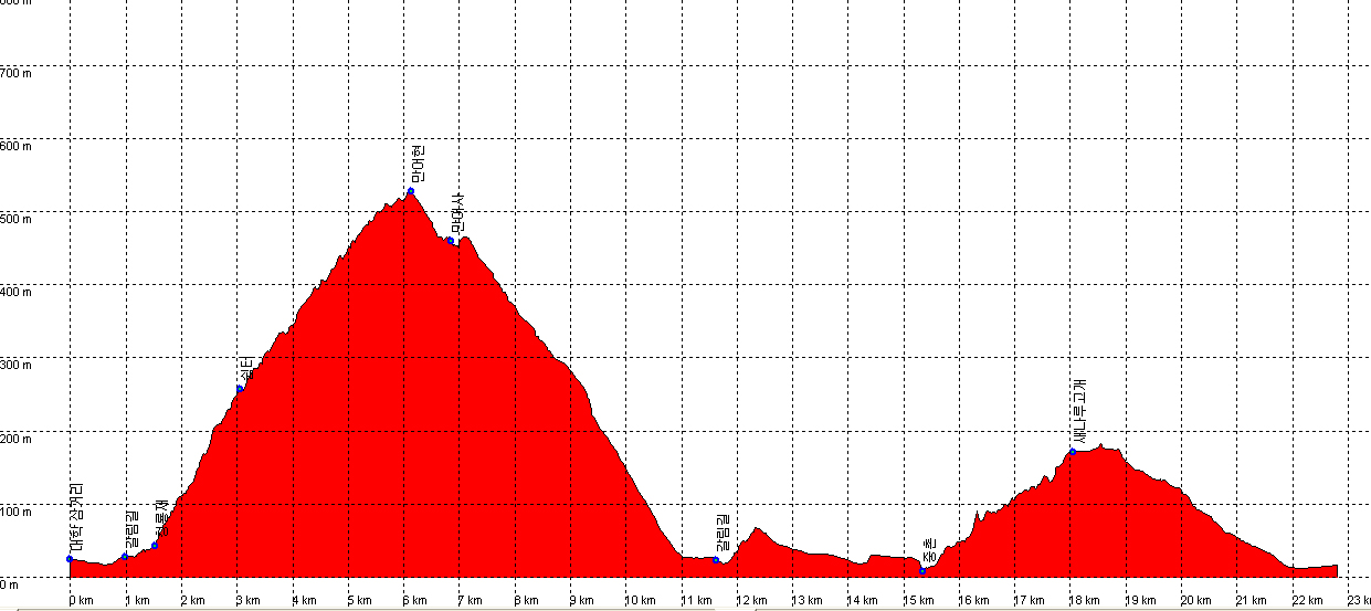 만어사에서 우곡리 마을 어귀까지도 거침없는 다운힐 구간이다. 해발이 460m에서 20m대로 떨어진다. 속도계가 시속 20~30㎞를 왔다 갔다 한다.