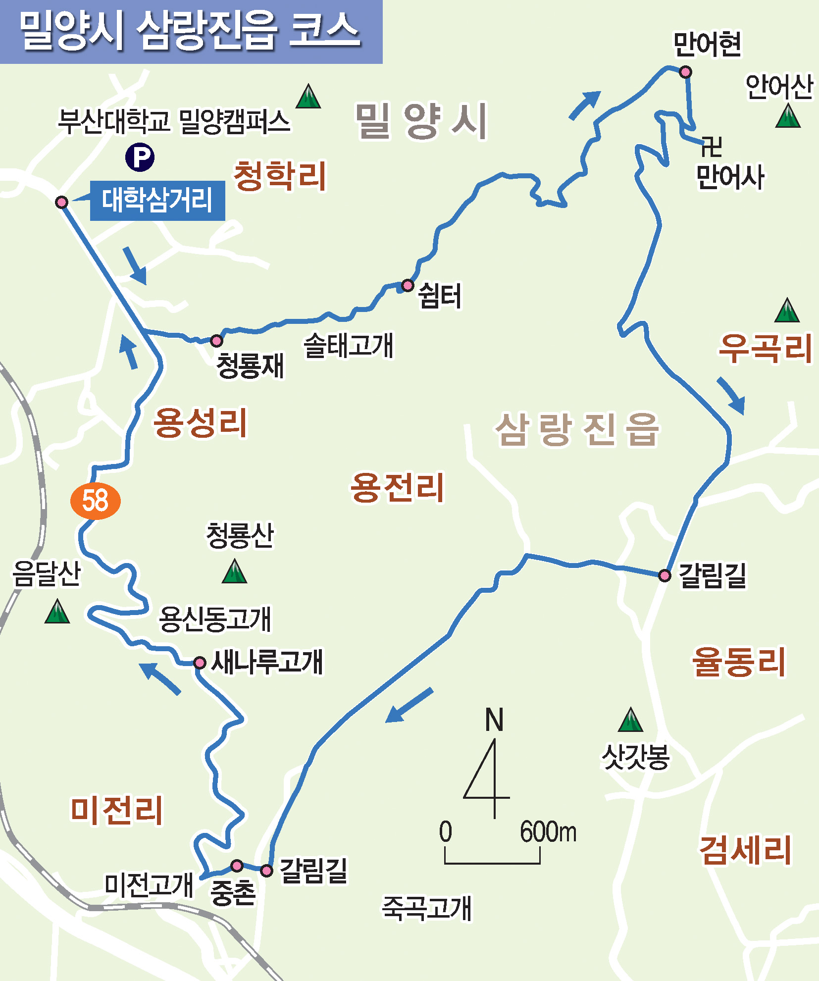 우곡리를 도로를 지나 율동리 앞에서 용전리로 핸들을 튼다. 고개 하나를 넘으면 미전리까지도 내리막길이 이어진다. 미전리에서 58번 국도를 따라 새나루고개까지 간다. 오르막 구간이지만 경사가 급하지 않아 여유 있게 새나루고개로 올라선다. 이 고개에서부터 청룡마을까지가 이번 구간의 하이라이트다. 엉덩이를 뒤로 빼 무게 중심을 낮춘다. 오른쪽 브레이크를 풀면서 내리막을 질주한다. 우우! 와와! 온갖 탄성이 나온다. 자전거는 쏜살처럼 고개 아래로 날아가는 것 같다. 약 4㎞의 다운힐이 끝날 무렵 부산대 밀양캠퍼스 앞 삼거리에 도착했다.