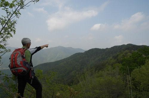 만지산과 국사봉에는 장사(壯士)들의 투석전 전설이 스며 있다. '산&산' 전준배 산행대장이 만지산과 국사봉을 가리키고 있다. 오른쪽 가까운 곳에 살짝 치솟은 봉우리가 만지산, 왼쪽으로 멀리 보이는 바위 봉우리가 국사봉이다.경남 의령의 산들은 올망졸망하다. 자굴산(897m)을 제외하고는 대부분 해발 500~600m 급이다. 덩치가 작다고 위엄이 떨어지는 것은 아니다. 오늘의 주 산행지인 만지산(萬芝山·606.5m)도 마찬가지다. 의령군 봉수면과 궁류면 경계에 있는 만지산은 낮지만 풍모가 당당하다. 정상으로 향하는 길에는 숲 속 곳곳에 기암괴석이 숨어 있어 얕볼 만한 산이 아니다.