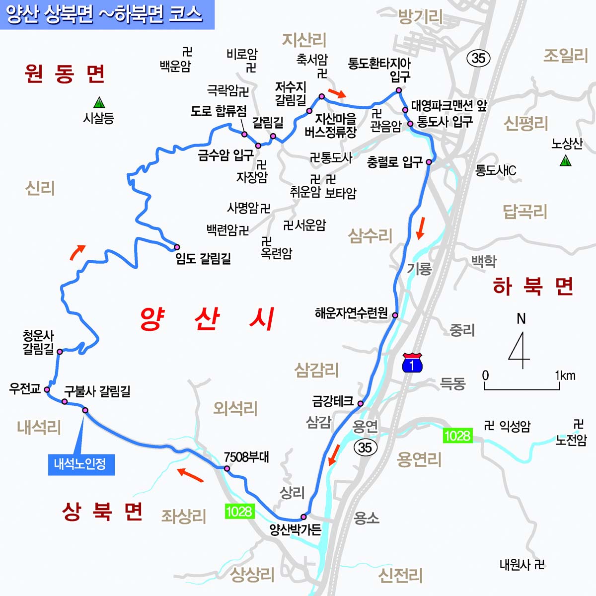 | ▲ 양산 상북~하북면 코스 지도 (※ 사진을 클릭하면 더 크게 볼 수 있습니다.) 그래픽=노인호 기자 nogari@ |