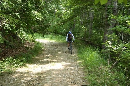 이후 줄곧 내리막길이다. 아름드리 굴참나무와 소나무들이 도열한 임도를 내리꽂듯 50분 가까이 달린다. 울퉁불퉁한 비포장 임도의 질감이 핸들을 통해 팔과 척추로 그대로 전달된다. 급하게 굽은 길에서 속도를 줄였다 높였다 반복하며 스릴을 만끽한다. 아름드리 굴참나무, 소나무들이 길 옆으로 도열해 있다. 주의할 점은 길 안쪽으로 늘어진 나뭇가지다. 속도를 내며 달리다 가지에 목이 걸려 다칠 수 있다.