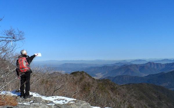 능선 삼거리 바로 옆에는 얼추 보아도 30㎡ 넓이는 됨직한 너럭바위가 배를 뒤집고 누웠다. 눈 덮인 너럭바위에 올라서니 멀리 산릉들이 겹겹이 포개져 넘실거린다. 왼쪽으로 대구의 비슬산, 창녕 화왕산과 영남알프스 산군들이 구름바다 위로 정수리만 볼록볼록 내놓고 있다. 오른쪽으로는 창원의 무학산과 김해의 불모산, 그 너머 부산의 금정산까지 파노라마처럼 펼쳐진다. 눈을 좀 더 오른쪽으로 옮기면 진동 앞바다와 거제도까지 보인다. 조망의 즐거움이 탁월한 전망 포인트가 아닐 수 없다.