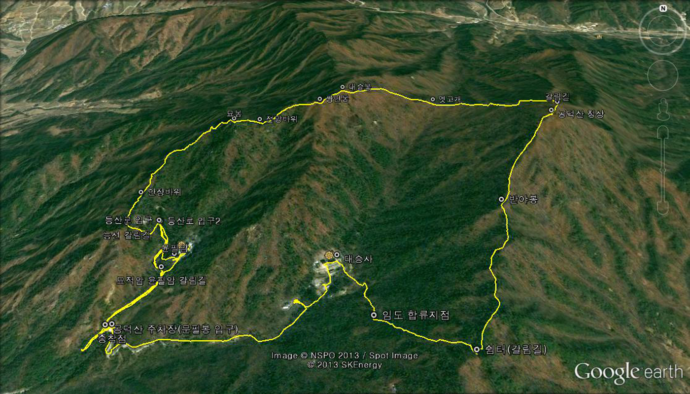 등산로는 대승사를 기점으로 원점회귀하는 코스가 일반적이지만 '산&산'은 접근성을 고려해 대승사 초입의 공덕산 주차장을 기점으로 삼았다. 구체적인 등로는 '공덕산 주차장~윤필암~안장바위~묘봉~전망바위~쌍연봉~대승봉~옛고개~공덕산 정상~방광재~대승사~공덕산 주차장'이다. 총길이 8.5㎞로 휴식시간을 포함해 5시간 30분가량 걸린다.