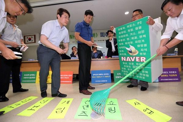 7일 오전 서울 영등포구 중소기업중앙회에서 소상공인연합회 창립준비위원회 산하 네이버(NHN)대책위원회가 '소상공인 네이버 피해사례 보고회'를 열고 네이버를 비판하는 퍼포먼스를 펼치고 있다. 연합뉴스국내 최대 포털 네이버가 그동안 소상공인 대표들로부터 '골목상권 침해'라는 비판을 받았던 '부동산 매물정보' 서비스 사업에서 철수키로 했다.
