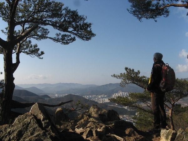 대추봉 정상에서 조금 못 미친 지점의 첫 조망 바위 위에서 전준배 산행대장이 서창 시내와 천성산, 정족산 등 주변 산군을 바라보고 있다.겨울 산행의 묘미는 호젓함에서 찾을 수 있다. 새해 첫 산행이라면 더욱 그렇다. 느긋한 걸음으로 한 발 한 발 산을 오르면서 새해 각오를 다지고, 사방이 확 트인 조망 바위에서 움츠린 가슴을 활짝 열어 세상과 조응하는 흥취가 요구된다.