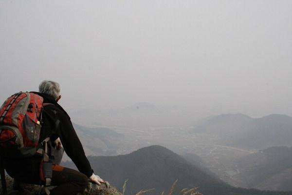 하지만 불행히도 안개가 많이 끼어 멀리 볼 수 없다. 다만, 아래 엎드린 육봉과 암봉이 여럿 조망되는 것으로 위안을 삼을 수밖에 없다. 이 정도의 높이에서 이렇게 많은 봉우리를 내려다볼 수 있는 것도 흔하지 않다. 백월산을 중국 태산에 비유하는 까닭을 헤아릴 수 있을 듯하다. 날씨가 좋다면 주남저수지는 물론이고 김해 봉하마을, 무척산, 밀양 수산(하남읍)까지 조망된다고 전준배 산행대장이 설명했다. 올라온 방향으로 천마산과 마금산이 버티고 섰다.