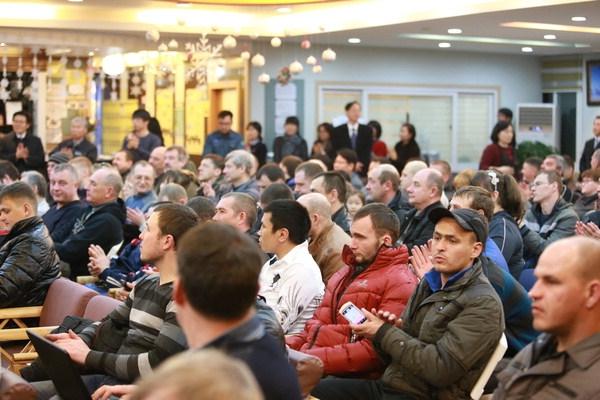 부산 감천 시멘스센터를 찾은 러시아 선원들이 선진엔텍에서 마련한 공연을 관람하고 있다. 선진엔텍 제공"우리 러시아 선원들에겐 감천항이 세계 최고의 휴식처입니다."