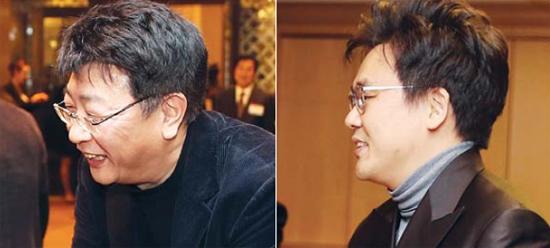 부산 출신의 영화감독 곽경택(왼쪽)과 영화배우 김인권이 행사장에서 참석자들과 인사를 나누고 있다. 박희만 기자