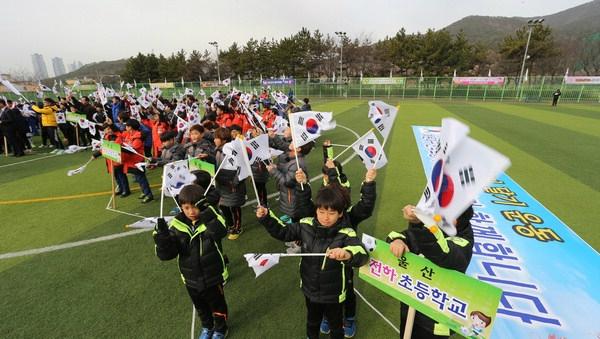 광복 70주년과 3.1절을 앞두고 전국 여기저기서 자주독립운동과 광복 관련한 행사가 개최중이다. 24일 부산 해운대구 장산공원에서 열린 전국초등학교축구대회에서 대회 시작전 참가 학생들이 태극기로 한반도 형태를 만드는 퍼포먼스를 연출해보이고 있다. 김병집 기자 bjk@24일 오전 부산 해운대구 장산 인조잔디구장에서 초등학교 축구 선수들이 태극기를 들고 한반도 모양 만들기 퍼포먼스를 펼쳤다.