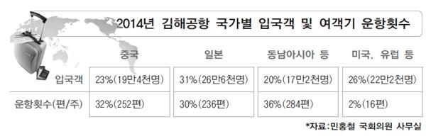 반면 국제노선의 편중은 심각한 것으로 나타났다. 김해공항과 미국·유럽 등지를 잇는 항공기 운항 횟수는 16편으로 전체 국제선 운항 횟수의 2%에 불과했다. 일본은 236편(30%), 중국은 252편(32%), 동남아시아는 284편(36%)이었다.