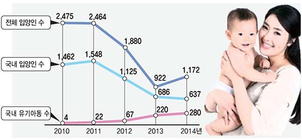 8일 보건복지부에 따르면 입양 건수가 2011년 총 2천464건(국내 1천548건, 해외 916건)에서 2014년 1천172건(국내 637건, 해외 535건)으로 절반 이상 줄었다. 2012년 8월 입양특례법 개정으로 입양 신고제에서 법원 허가제로 바뀐 이후 발생한 현상이다. 부산에서도 2011년 총 221건이던 입양이 2014년 126건, 지난해 72건으로 역시 반 이상 축소됐다.