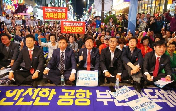 부산지역 여·야 국회의원들이 2일 오후 부산 서면 쥬디스태화 앞에서 열린 '가덕신공항 유치 염원, 범시민 촛불 행사'에 참가해 시민단체 대표들의 말을 듣고 있다. 정종회 기자 jjh@부산의 미래 성장동력으로 통하는 동남권 신공항 입지 결정이 코앞에 다가왔다.