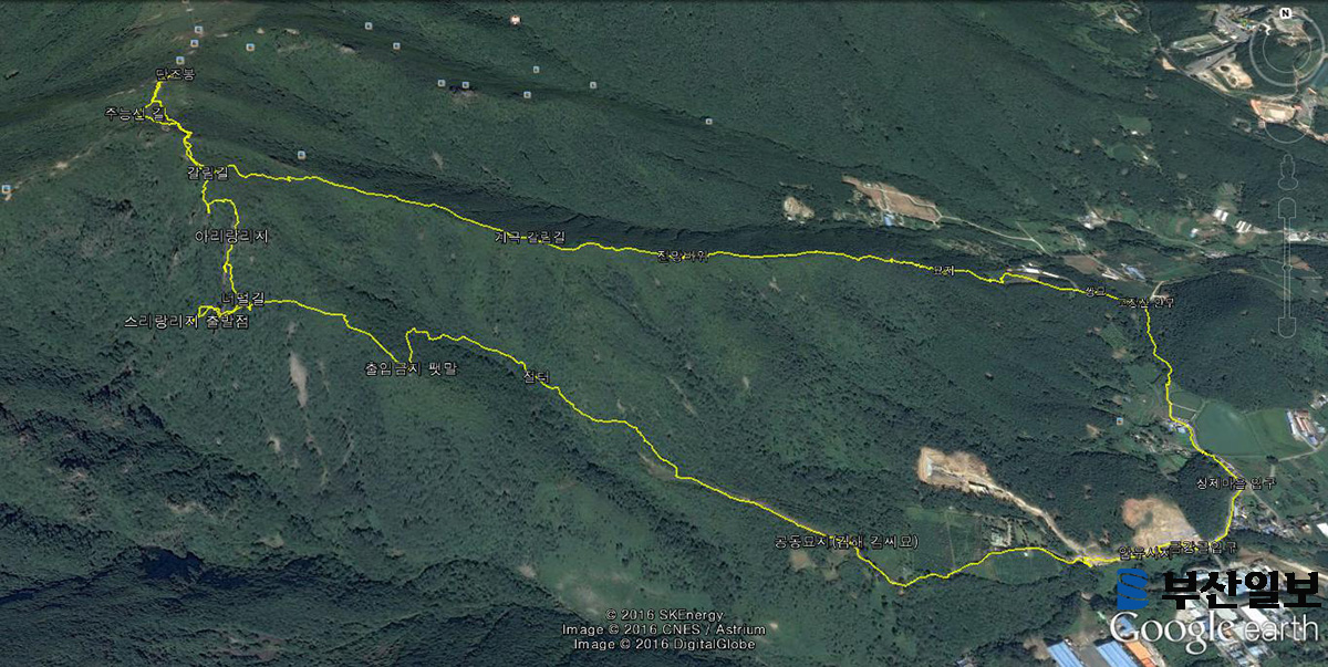 작가이자 영남알프스학교 이사장인 배 작가의 안내를 받아 장제마을~고장산 안부~묘지~전망 바위~계곡 갈림길~아리랑리지 갈림길~주능선~단조봉~아리랑리지 갈림길~짚차바위~아리랑리지~마당바위~너덜겅~쓰라링리지 입구에서 너덜겅길로 다시 되돌아 나와 군 사격장 출입금지 팻말~절터~김해 김씨 묘~압류사지~금강골 입구~장제마을까지 8㎞를 6시간 40분 동안 걸었다.