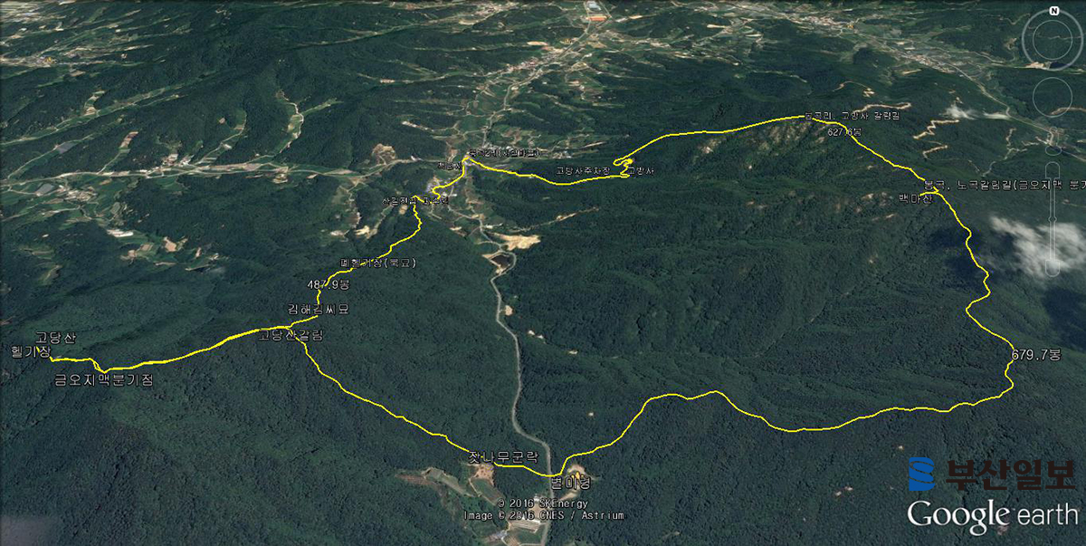 백마산은 아는지 모르는지 금오지맥을 따라 낙동강을 향해 힘차게 달리는 자세다. 산의 이름이 흰말 같다고 백마산이라고 부른다는 설이 있다. 백마산만 오르는 것은 거리가 짧기에 인근 고당산(603.5m)을 준비 운동 삼아 오르기로 했다.