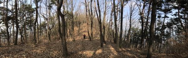 청룡 등에 올라타니 모든 것이 편안해졌다. 콧노래가 나올 정도로 고저가 없는 산길이 이어진다. 아름드리 떡갈나무와 굴참나무가 자주 눈에 띈다. 큰 나무를 만나니 기분이 좋다. 하서산에 도착했다. 진등산 능선에는 어느 봉우리든 정상석은 없다. 산꾼들이 드물게 달아놓은 리본 정도가 있을 뿐이다. 하서산 정상을 확인하고 습관처럼 직진했는데 길이 희미해진다. 점점 잡목이 우거지더니 아예 사라진다. 그제야 길을 잘못 든 걸 알았다. 동행한 건건산악회 김태영 전 회장이 온 길로 되돌아갔다.