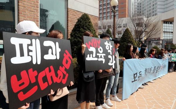 22일 오전 부산 경성대 본관 앞에서 교육학과 학생들이 폐과에 반대하는 집회를 갖고 있다. 강원태 기자 wkang@