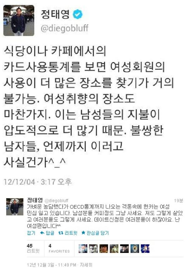 정 부회장은 지난 2012년 12월 4일 트위터에 "식당이나 카페에서 카드 사용 통계를 보면 여성 회원의 사용이 더 많은 장소를 찾기가 거의 불가능"하다며 "이는 남성들의 지불이 압도적으로 많기 때문. 불쌍한 남자들 언제까지 이러고 사실 건가"라는 글을 올렸다.