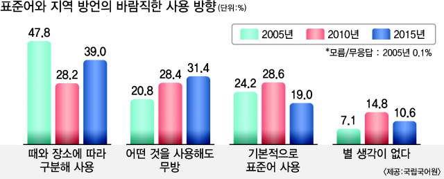 눈에 띄는 것은 방언에 대한 사람들의 인식 변화다. 표준어와 지역 방언 중에서 기본적으로 표준어를 사용하고 지역방언을 사용하지 말아야 된다고 생각하는 사람은 19%로 나타났다. 2010년 28.6%에 비해 9.6%P 낮아졌다. 반면 표준어와 지역 방언 중 어떤 것을 사용해도 무방하다는 응답은 31.4%로 2010년(28.4%)보다 약간 상승했다. 때와 장소에 따라 표준어와 지역 방언을 구분해서 써야 한다는 비율은 28.2%에서 30%로 10%P 이상 뛰었다. 방언에 대한 부정적인 인식이 점차 약화되고 있는 것이다.