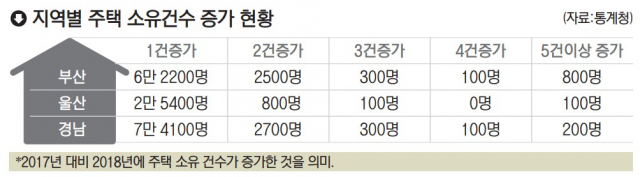 하지만 부산에서 무주택 가구는 56만 8000호로 41.6%에 이르렀다. 통계청 관계자는 “1인가구 등이 늘어나면서 무주택가구로 잡히는 경우도 많이 있다”고 밝혔다. 부산 주택 중 10만 4700호는 외지인이 소유하고 있었는데 경남 양산·김해·창원에서 사는 사람이 1~3순위로 많이 가지고 있었다.