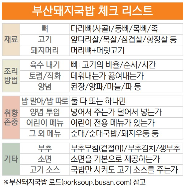 부산돼지국밥은 다 똑같지 않다. 겉모양도 그렇지만 재료, 조리 방법, 찬의 종류, 먹는 방법까지 조합한다면 “국밥 고수가 될수록 300가지 경우의 수가 있다”는 송정삼대국밥 3대 경영자 김기훈(50) 씨의 말도 과장이 아닐 수 있다.