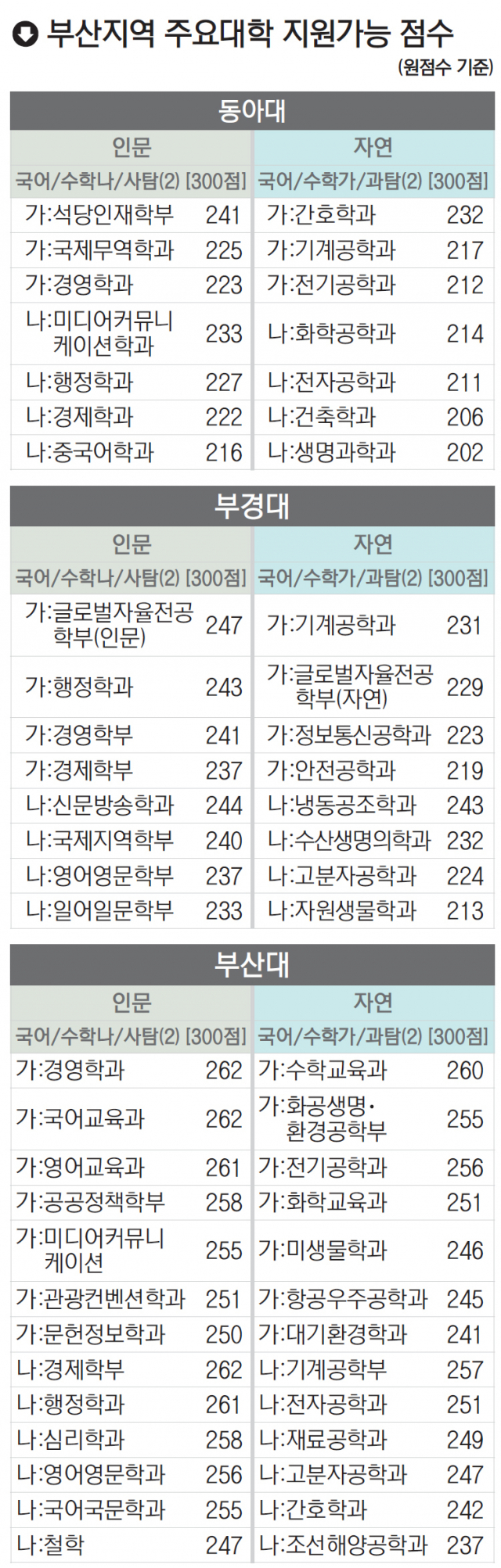 부산지역 상위권 대학에 지원 가능한 점수대는 인문사회 계열 수험생의 경우 지난해와 비교해 1~5점 정도 하락할 것으로 예상된다. 부경대, 동아대 지원 가능 점수대도 4~7점 정도 하락할 것으로 전망된다.