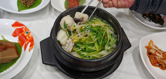 곧이어 사각 접시에 회가 가득 담겨 나온다. 감성돔, 광어, 방어, 우럭이 두툼한 40개의 조각으로 열을 맞춰 깔려 있다. 커다란 사기그릇이 옆에 놓이는데, 얼큰한 매운탕 위로 김이 모락모락 피어오른다. 시내에서 ‘회 정식’을 먹으면, 회는 몇 조각되지 않고 밑반찬이나 매운탕도 부실한 경우가 꽤 있다. 그런데도 회라는 것이 귀한 음식이라 그러려니 하며 먹기 마련이다. 그런 회 정식을 먹다가, 자연산 회가 풍성한 회 정식을 만나니 맛을 보기 전에도 이미 만족스러운 기분이다. 2인분 회 정식이 웬만한 소자 회 세트 같다고 말해도 그리 과장된 건 아닐 듯하다.