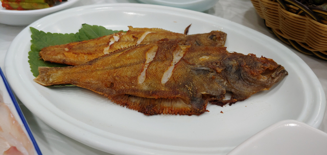 밑반찬이 깔리는데, 웬만한 회 세트에 딸린 것들이 다 올라온다. 묵, 오이무침, 멸치볶음, 해초요리 등 15개가량의 밑반찬 중에서도 노릇하게 굽힌 가자미구이가 유난히 돋보인다. 살이 올라있는 것이 군침을 돌게 만든다. 굳이 회가 없이 이 정도 반찬만 가지고도 한 끼 식사는 충분할 것 같다.
