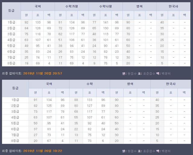 20일 오후 8시 57분 기준 EBSi의 고2 실시간 등급컷에 따르면 국어 1등급 92점-2등급 84점-3등급 75점이고, 수학 가형은 1등급 81점-2등급 72점-3등급 62점이다. 수학 나형은 1등급 77점-2등급 65점-3등급 48점이다.