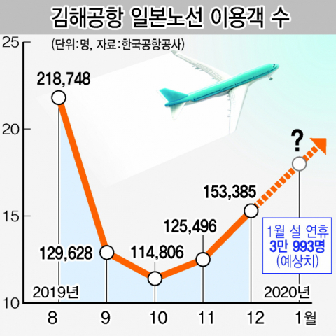 ‘아베 보이콧’으로 극에 치달았던 한·일 교류 단절이 점차 사그라들고 있다는 판단에서다. 에어부산 관계자는 “설 연휴 3~4일로 짧아 동남아 여행에 부담을 느끼는 고객이 많다”며 “일본 탑승률을 작년과 단순 비교하면 아직도 많이 부족하지만, 그래도 현장에서는 분위기가 점차 좋아지고 있는 것을 느낀다”고 말했다. 김해국제공항에서 일본노선을 이용한 승객 역시 지난해 10월 11만 4806명으로 최저치를 기록했다. 이후 12월에 이용객 숫자가 15만 3385명으로 4만 명 가까이 증가했다.