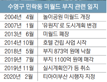 부산 수영구 민락동 옛 미월드 땅에 호텔 건립이 다시 추진된다. 지난해 1100억 원에 땅을 인수한 민간 사업자가 시행자 자격을 획득한 것이다. 기존 인가와 사업자 지정은 지난해 11월 취소됐다. 부산시는 새 시행자에 대해 적극적으로 행정 지원을 하겠다는 입장이다. 2014년 시작된 이래 지지부진하던 이 사업이 탄력을 받을지 주목된다.