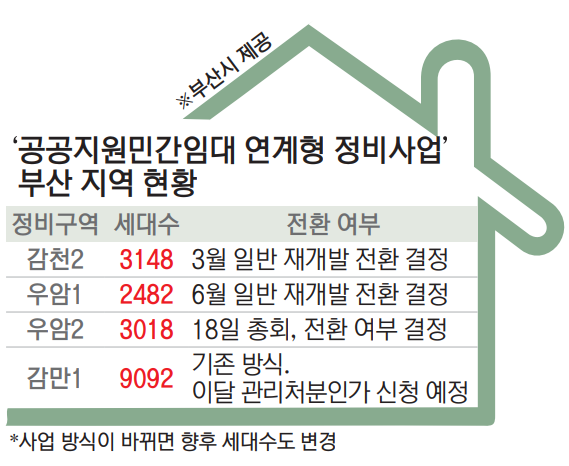 부산시에서는 사업 전환을 막기가 어렵다는 입장이다. 부산시 손인상 도시정비과장은 “공공지원 정비사업은 임대를 조건으로 용적률 상향 등의 혜택을 받는데, 일반 재개발로 전환하면 설계, 정비계획 입안, 도시계획위원회 심의 등의 절차를 처음부터 다시 밟아야 한다”며 “전환으로 발생하는 모든 문제는 조합원들이 감당하거나, 민사적으로 해결해야 한다”고 밝혔다.