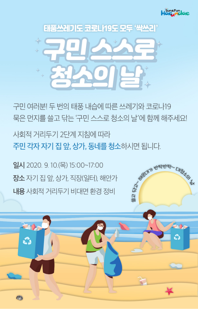 해운대구(구청장 홍순헌)는 10일 오후 3~5시, 마이삭·하이선 등 두 번의 태풍 내습에 따른 쓰레기와 코로나19 묵은 먼지를 쓸고 닦는 ‘힘내라 해운대! 구민 스스로 청소의 날’을 운영한다.