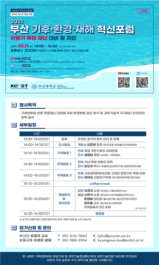 부산대학교 기후과학연구소(소장 하경자·대기환경과학과 교수)와 한국과학기술단체총연합회 부산울산지역연합회(회장 이준현, 이하 ‘부울과총’)는 부산대 기후변화 특성화대학원 및 녹색융합기술-저영향개발 특성화대학원과 공동으로, 11일 오후 부산대 양산캠퍼스 한국그린인프라저영향개발센터에서 「부산 기후·환경·재해 혁신포럼」을 개최했다.