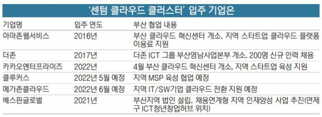 앞서 2016년 아마존웹서비스(AWS)가 동서대 센텀캠퍼스 12층에 입주해 부산 클라우드 혁신센터를 성공적으로 운영해 왔고, 부산시와 정보산업진흥원이 클라우드 역외기업을 센텀시티에 유치하면서 얻어진 결과다.