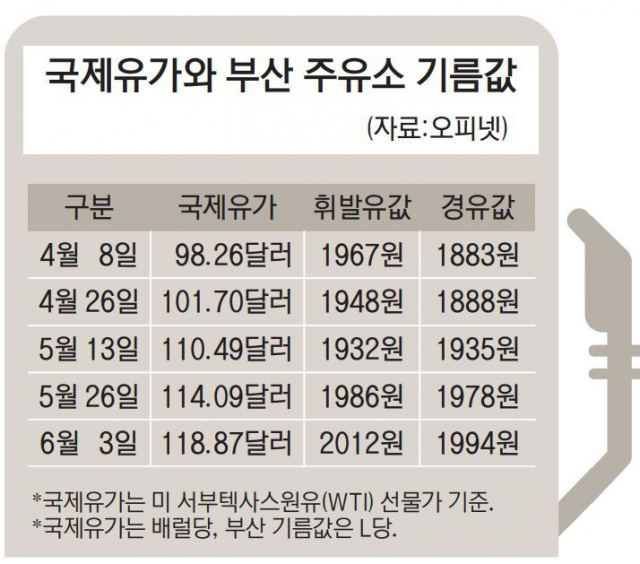 4일 기준 국내 평균 휘발유가격은 L당 2027원, 경유는 2019원을 나타냈으며 부산 지역 주유소에서는 휘발유가 2017원, 경유는 1998원를 각각 기록했다.