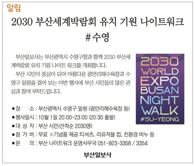 부산일보사는 부산광역시 수영구청과 함께 2030 부산세계박람회 유치 기원 나이트 워크를 개최합니다.