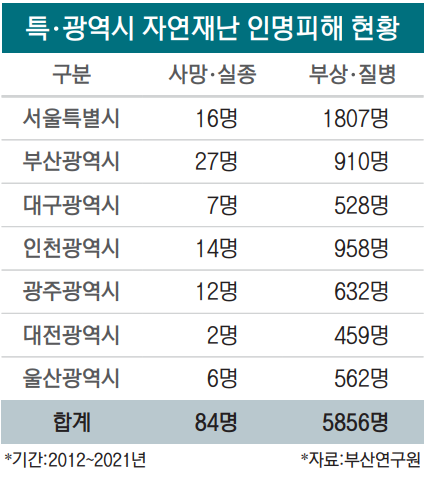 센터에 따르면, 2012~21년 부산에서 자연 재난으로 사망하거나 실종한 수를 취합한 결과 27명으로 조사됐다. 7개 대도시의 합계는 84명이다. 부산에서는 풍수해 등으로 인한 피해가 가장 심각한 것으로 분석됐다.