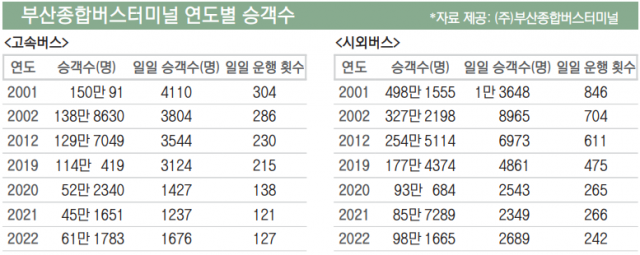 노포동 버스터미널의 위기는 이용객 감소로 극명하게 드러난다. 11일 (주)부산종합버스터미널에 따르면, 부산종합버스터미널이 노포동으로 자리를 옮긴 첫해인 2001년 승객 수를 보면 고속버스 150만여 명, 시외버스 498만여 명에 달했다. 이후 꾸준한 감소세를 보여 20년이 지난 2022년 승객 수는 고속버스 61만여 명(-60%), 시외버스 98만여 명(-80%)이었다. 이용객이 주는 바람에 버스 운행 횟수와 노선이 줄고, 교통편이 감소하니 승객이 또 줄어드는 악순환이 되풀이되고 있다. 결국 2021년 6억 원대, 지난해 3억 원대 적자를 기록했다. 코로나19 여파가 반영된 결과이기는 하지만 이전부터 이어진 추세를 봤을 때 곧 만성적인 적자 구조에 빠질 것이라는 게 운송업계의 대체적인 전망이다.