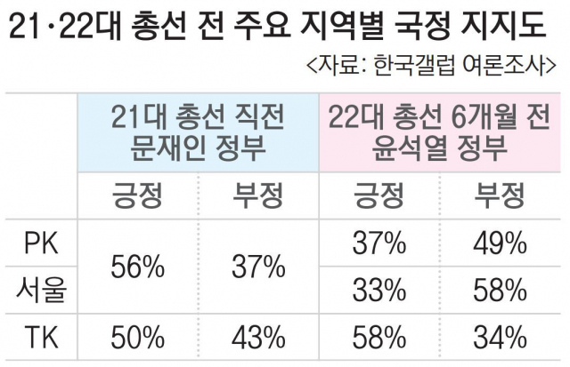 주목할 점은 최근 PK 여론이 대구·경북(TK)과는 크게 다르고, 오히려 서울과 비슷한 흐름을 보이고 있다는 사실이다. 지난 13일 발표된 한국갤럽 여론조사(10∼12일, 1002명 대상)에서 윤석열 대통령의 국정 지지도를 8개 지역별로 보면 PK의 경우 긍정 37%·부정 49%로 긍정 33%·부정 58%를 보인 서울과 가장 비슷했다. TK는 긍정 58%·부정 34%였다.