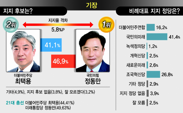 〈부산일보〉와 부산MBC 공동 의뢰로 한국사회여론연구소(KSOI)가 지난 8~9일 부산 기장군 거주 만 18세 이상 502명을 대상으로 실시한 4·10 총선 여론조사 결과, 국민의힘 정동만 후보는 46.9%의 지지율로 민주당 최택용(41.1%) 후보를 5.8%포인트(P) 앞서는 것으로 조사됐다. 양 후보는 오차범위(±4.4%P) 내 접전을 벌이는 것으로 나타났다. 기타 후보를 지지한다는 답변은 4.9%, 지지 후보 없음 3.8%, 잘 모른다는 답변은 3.2%로 나타났다. 정당 지지율은 국민의힘 46%, 민주당 34.4%, 지지 정당 없음 7.3% 순으로 나타났다. 비례정당 투표에서는 조국혁신당의 돌풍이 특히 거셌다. 조국혁신당은 더불어민주연합(16.2%) 지지율을 훌쩍 뛰어넘은 26.8%를 기록했다. 국민의미래는 41.4%로 나타났다. 친명계로 분류되는 최 후보가 조국혁신당 세를 흡수할 수 있을지도 관전 포인트로 떠올랐다.