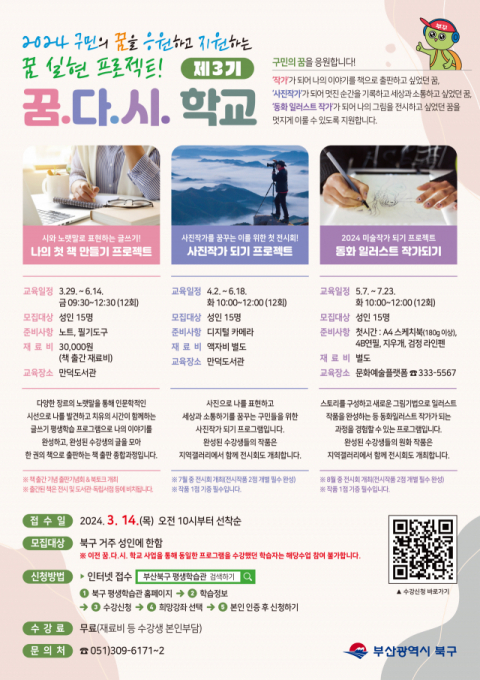‘꿈.다.시. 학교’의 출판과 사진, 미술분야 프로그램은 오는 3월부터 7월까지 운영되며, 관심이 있는 구민 누구나 3월 14일 오전 10시부터 북구평생학습관 홈페이지를 통해 온라인 신청 가능하다.
