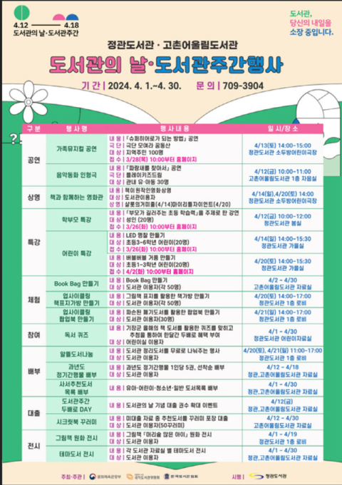 기장군(군수 정종복)은‘2024년 도서관의 날·도서관주간’을 맞아 ‘도서관, 당신의 내일을 소장 중입니다’라는 주제로 4월 한 달간 풍성한 독서문화 행사를 진행한다고 2일 밝혔다.