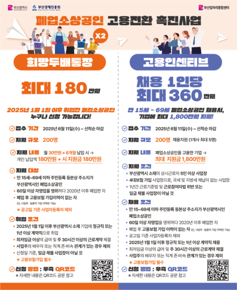 부산시(시장 박형준)와 (재)부산경제진흥원(원장 송복철, 이하 진흥원)은 폐업소상공인의 취업을 체계적으로 지원하기 위해 '폐업소상공인 고용전환 촉진 사업'을 본격 추진한다고 밝혔다.