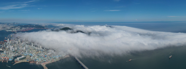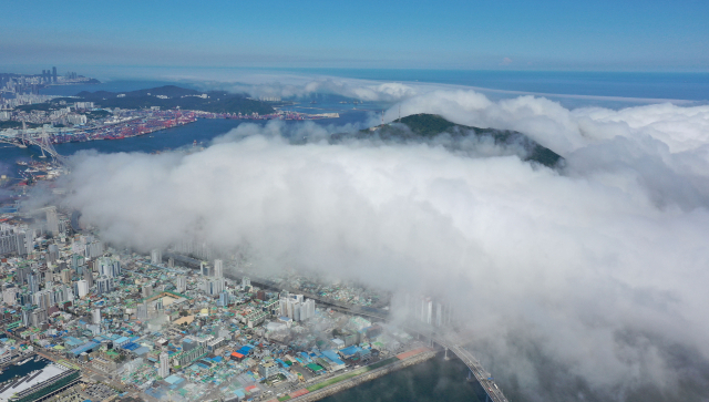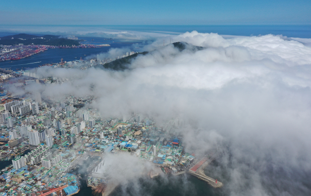 부산 지역에 폭염 특보가 발효된 30일 오후 부산 영도구 봉래산 일대에 짙은 해무가 밀려들어 장관을 연출하고 있다.
