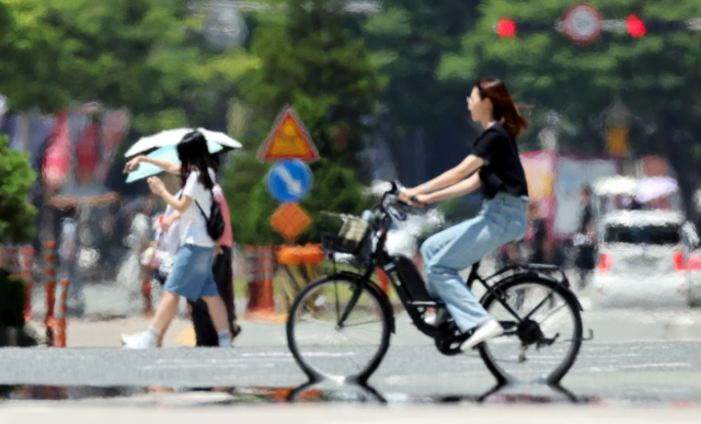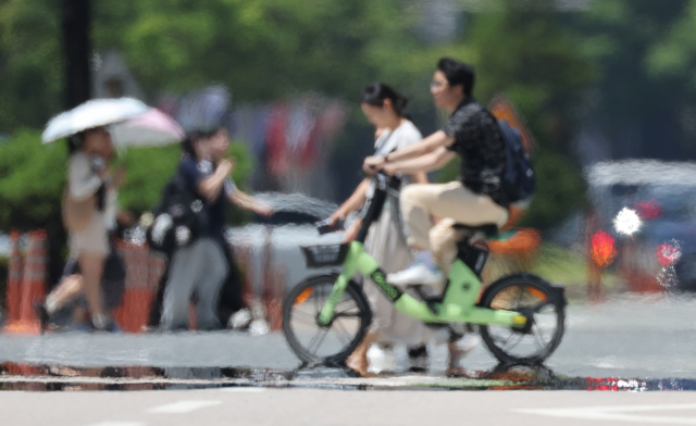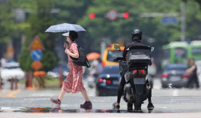 2일 부산 해운대구 벡스코 인근에서 한 배달 오토바이가 지열로 달궈진 도로를 지나가고 있다. 정종회 기자 jjh@